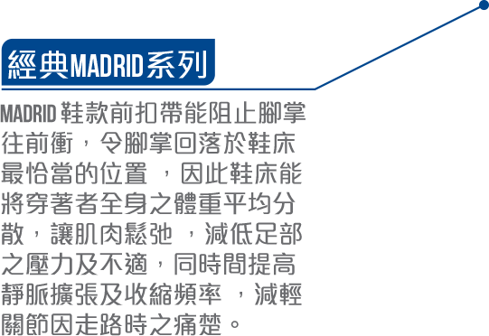 Madrid鞋款前扣帶能阻止腳掌往前衝,令腳掌回落於鞋床最恰當的位置 ,因此鞋床能將穿著者全身之體重平均分散,讓肌肉鬆弛 ,減低足部之壓力及不適,同時間提高靜脈擴張及收縮頻率 ,減輕關節因走路時之痛楚。