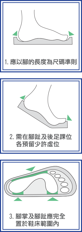 隨後每天多加一小時試穿,約一星期後,雙腳應能適應,而你的走路姿勢已因應穿着矯正鞋而改變。 - 穿着初期如想減輕痛楚,提議可穿有厚度之襪子試穿。